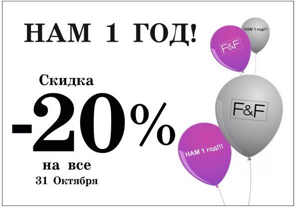 Магазин F&F в ТРЦ Мега Парк приглашает на свой первый день рождения! Только сегодня действует скидка 20% на все! Мы ждем Вас в ТРЦ Мега Парк, Алматы, 2 эт.