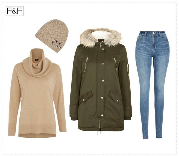 Парка, теплый свитер и джинсы идеально подойдут для зимней прогулки!