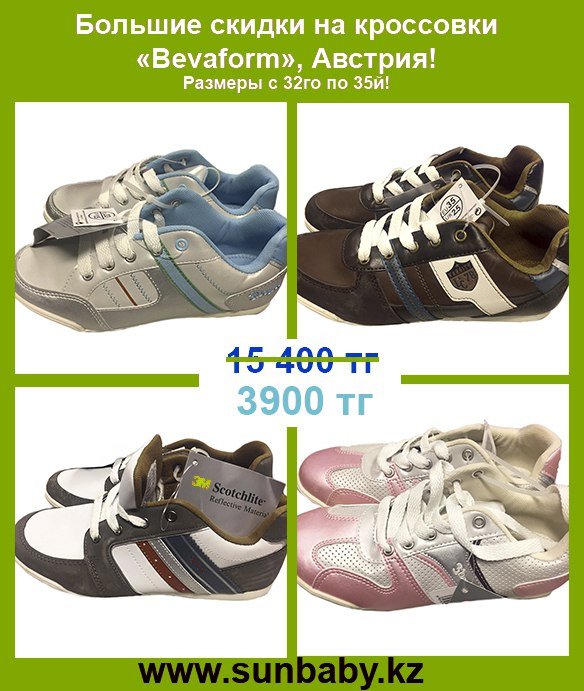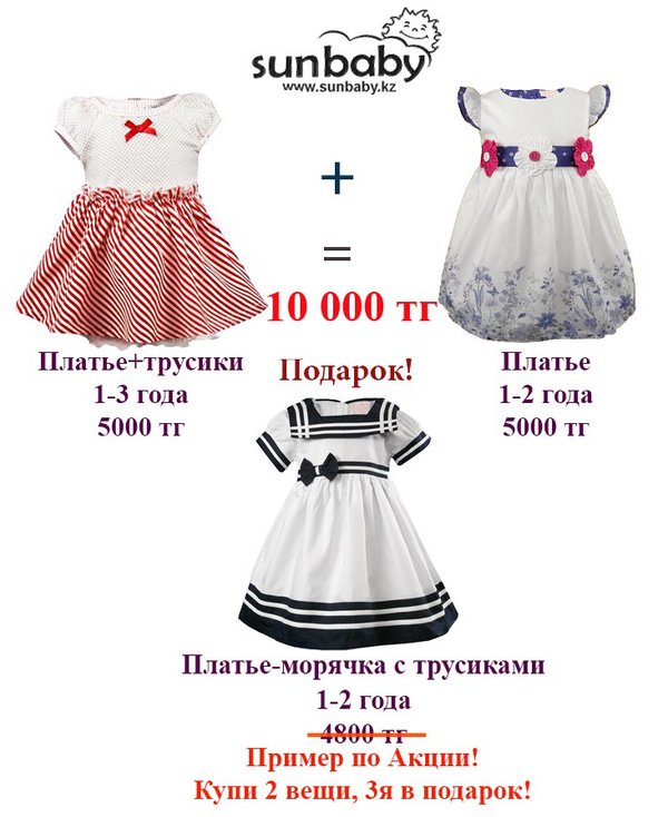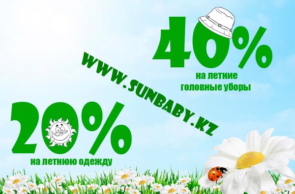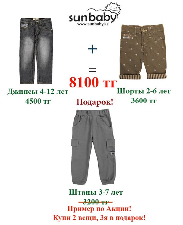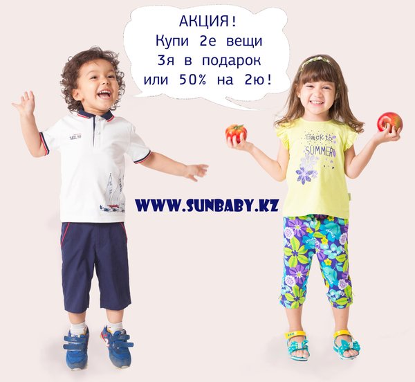 Условия акции уточняйте в магазинах, или по телефонам. «SUNBABY Сары-Арка» г.Алматы, 4 мкр. д.24 кв.19, ул. Алтынсарина, с правой стороны от входа в кинотеатр «KINOPLEXX Sary-Arka ». Режим работы: каждый день с 10-ти до 19-ти часов. Тел. 276-82-66 «SUNBABY-MAXIMA» ТРК «MAXIMA», г.Алматы, Райымбека 239 Г, 1й этаж, левое крыло. Режим работы: каждый день с 10-ти до 22-х часов. Тел.
