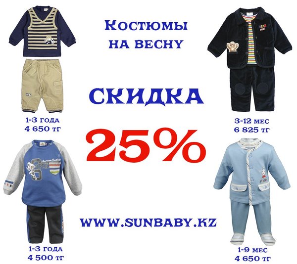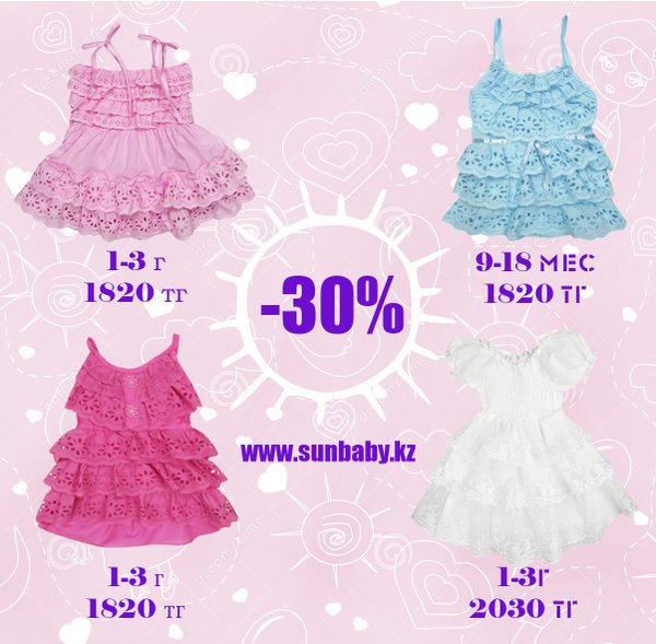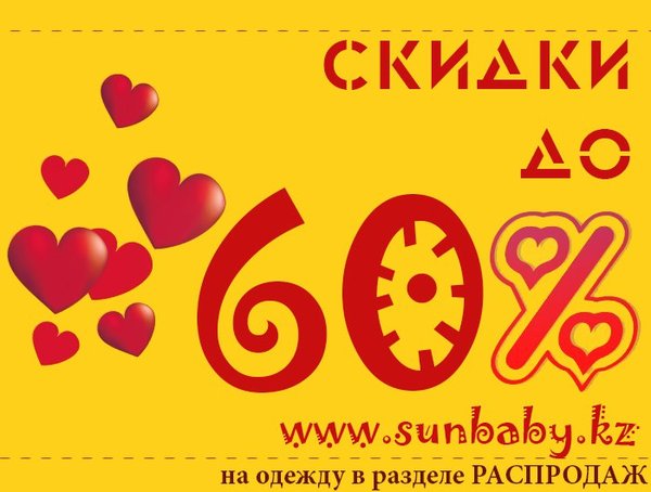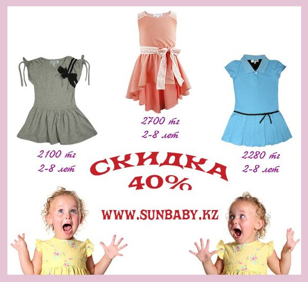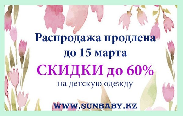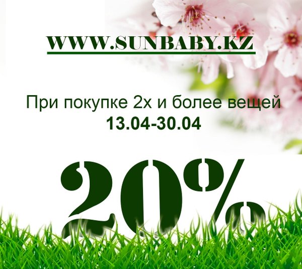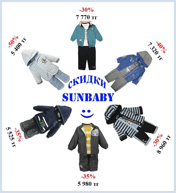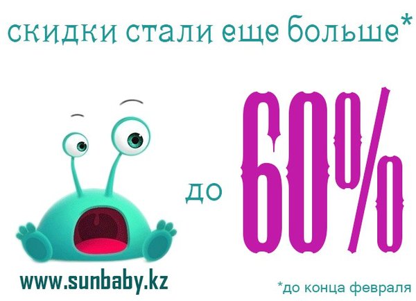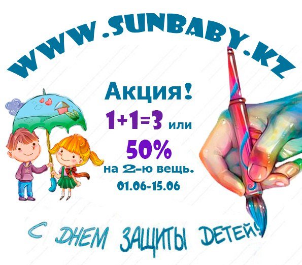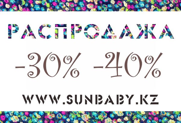 В магазинах SUNBABY проходит распродажа! 30—40% на весь ассортимент! Успейте сделать выгодные покупки! «Sunbaby Сары-Арка» г.Алматы, 4 мкр. д.24 кв.19, ул. Алтынсарина, с правой стороны от входа в кинотеатр «KINOPLEXX Сары-Арка». Режим работы: каждый день с 10-ти до 19-ти часов. Тел. 276-82-66 «Sunbaby-МАКСИМА» ТРК «МАКСИМА», г.Алматы, Райымбека 239 Г, 1й этаж, левое крыло. Режим работы: каждый день с 10-ти до 22-х часов. Тел. 227-33-28