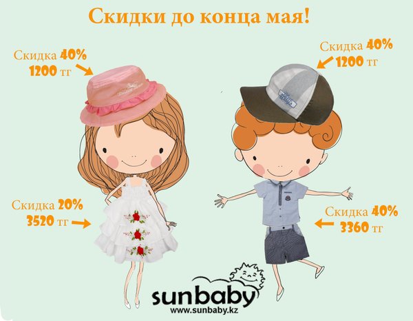 Погода нас уже радует по-летнему! Время обновить летний гардероб ваших деток! Мы рады предложить вам летние головные уборы из Тайланда со скидкой 40%! На весь летний ассортимент одежды скидка 20%! Предложение действует до конца мая! В магазинах г.Алматы: «SUNBABY Сары-Арка» г.Алматы, 4 мкр. д.24 кв.19, ул. Алтынсарина, с правой стороны от входа в кинотеатр «KINOPLEXX Sary-Arka ». Режим работы: каждый день с 10-ти до 19-ти часов. Тел. 276-82-66 «SUNBABY-MAXIMA» ТРК «MAXIMA», г.Алматы, Райымбека 239 Г, 1й этаж, левое крыло. Режим работы: каждый д… — Читать дальше