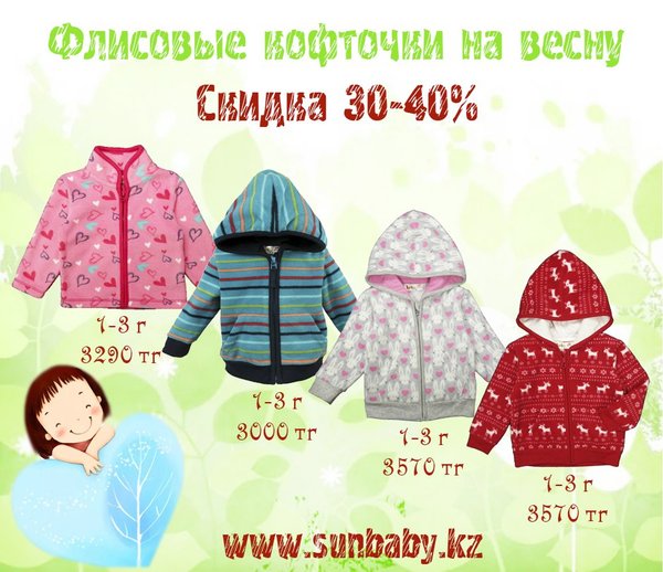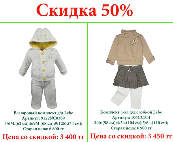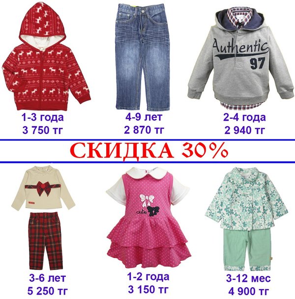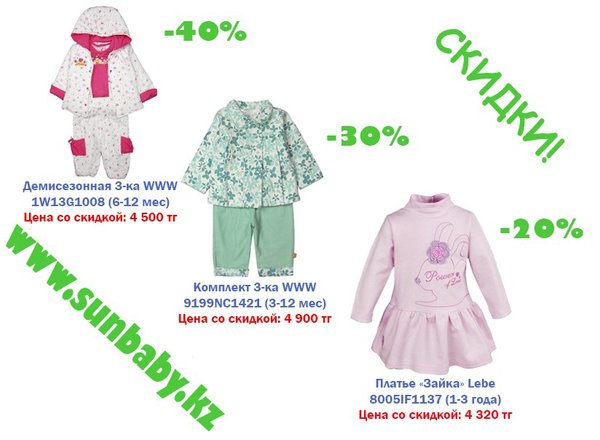 Такого у нас еще никогда не было!!! Только до конца Февраля у нас финальная распродажа этого сезона: от 30% на детскую одежду Таиланд, а некоторые позиции даже до 60%, 20% на все зимние куртки и комбинезоны пр-ва Пекин, конверты и товары «Мой Ангелок», шапочки пр-ва Россия и Польша, носочки и колготки. Воспользоваться предложением вы можете в магазинах г.Алматы! В нашем интернет-магазине пополнились разделы постоянных скидок, а на большинство товаров скидка выросла:) Раздел для девочек: Раздел для мальчиков: