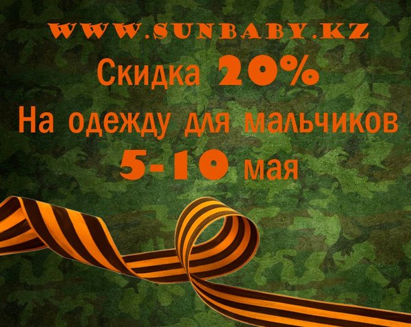Мы любим и уважаем наших мужчин! И маленьких и больших! В честь Дня Защитника Отечества и Дня Победы Дарим скидку 20% на одежду для мальчиков! Акция действует 5-6-7-8-9-10 мая! Предложением вы можете воспользоваться в наших магазинах: «SUNBABY Сары-Арка» г.Алматы, 4 мкр. д.24 кв.19, ул. Алтынсарина, с правой стороны от входа в кинотеатр «KINOPLEXX Sary-Arka ». Режим работы: каждый день с 10-ти до 19-ти часов. Тел. 276-82-66 «SUNBABY-MAXIMA» ТРК «MAXIMA», г.Алматы, Райымбека 239 Г, 1й этаж, левое крыло. Режим работы: каждый день с 10-ти до 22-х… — Читать дальше