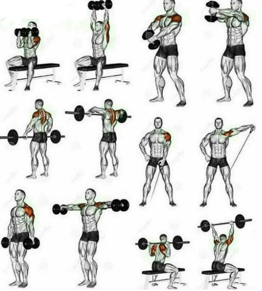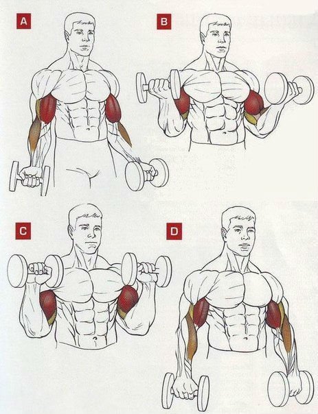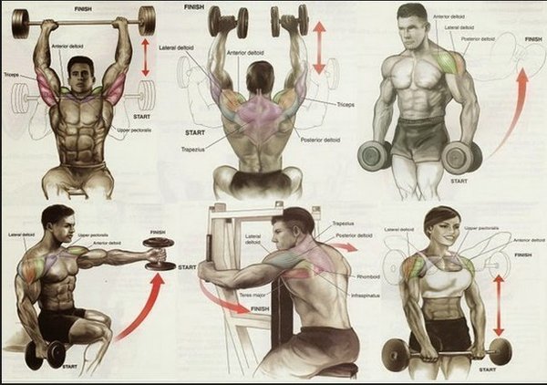 Поскольку ширину плечам задает средний пучок дельт, то его раскачку считают в бодибилдинге главной. С этой точки зрения жим штанги культуристу невыгоден. Штанга ставит силовой акцент на передних пучках дельт, даже если вы жмете ее из-за головы. Только гантели нагружают средний пучок дельт на все 100%! Причина? Вы жмете гантели вдоль осевой линии тела, ну а штанга движется либо впереди (жим с груди), либо позади (жим из-за головы) оси тела. Упражнение можно также выполнять сидя.