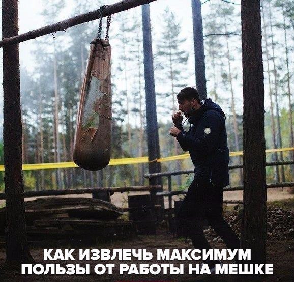 хлестко. Вовремя расслаляйте руки, и возвращайте их в исходное положение как можно быстрее. Помните, контакт с мешком должен быть максимально коротким. 2. Крепко стойте на ногах В мешок должны лететь ваши руки, а не вы сами. Во время серии расставьте ноги пошире, следите за равновесием, от слаженной работы рук и ног зависит мощь ваших ударов. Не делайте по отношению к мешку лишних движений, которые вы не стали бы делать в бою. Не стоит толкать мешок корпусом или головой, такая привычка, однажды развившись, может сыграть с вами злую шутку в бою. Боксируя с мешком представляйте партнера. 3. Больше передвижений Работа на мешке — это не только удары. В перерывах между атакующими действиями следует выполнять защитные. Это уклоны и нырки после серий, а так же перемещения вокруг мешка. Особенно полезны имитации контр атак со смещением с линии атаки. Просто попробуйте перед одной из серий как бы забежать за переднюю руку воображаемого противника. 4. Делайте серии по 3—6 ударов Предпочтительное количество ударов в серии 3—6. Не стоит работать всего на 1,2, но и перебирать не стоит, серия из 10 ударов маловероятна в бою. 5. Используйте рваный ритм атаки Серии ударов должны образовывать комбинации. Начинайте с простых вроде: 1-2-1-2, 2-1-2, и.т.п., затем постепенно переходите к менее ожидаемым и более сложным: 3-1-2-3-3. Однажды выведя свои базовые навыки на должный уровень, вы начнете усложнять комбинаторику своего боя, умение действовать не шаблонно, вот что поставит вас на шаг впереди ваших противников. 6. Бейте выше Незначительное, но постоянное упреждение вверх относительно горизонтали обезопасит вас от ситуации, когда в бою ваш противник оказался выше вас, а ваши руки привыкли бить перед собой или даже чуть ниже. Тогда с непривычки мышцы рук гораздо быстрее устанут. 7. Держите руки выше Легко оказаться в плену иллюзий стоя перед мешком, который не дает сдачи, не теряйте бдительности никогда. Прикрывайте голову и корпус свободной рукой во время нанесения ударов, во время передвижений держите руки высоко в защитной позиции. Постоянно оттачивайте правильную технику. Когда в бою вас будут бить, вы и не вспомните этих рекомендаций, но ваше тело сделает это за вас. 8. Бейте Мешок надо бить постоянно. Наносите серию, затем защитные действия, затем перерыв на восстановление совмещенный с передвижением и снова в атаку! Не стоит проявлять излишнюю бережливость,в бою если не бьешь ты, значит бьют тебя. Бороться за жизнь и бегать от ударов на ринге вам уже сейчас могут помочь ваши инстинкты,а быть хищником — это то, что в себе надо воспитать. Обратите внимание на то, как тренируются на мешке профессионалы и начинающие боксеры. У первых пауза между сериями едва составит 2—3 секнды, когда как вторые позволяют себе отдыхать по 10—15 секуд. В бою такого не бывает. 9. Контролируйте дыхание Характер нагрузок при работе на мешке сродни бегу или интервальному бегу. Вы должны быть выносливыми. Никакая техника не поможет вам во уже втором раунде при плохой функциональной подготовке. Поэтому не концентрируйтесь на силе ударов, расслабьтесь и контролируйте дыхание. Каждый удар — взрывной выдох, в перерыве вдох. 10. Правильно смотрите на мешок Это может вас удивить, но не тренированный взгляд зачастую является причиной плохой реакции и пропущенных ударов, а так же может вчистую раскрыть 