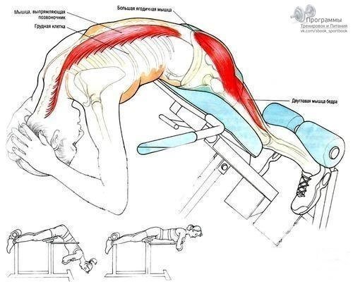котором тело будет представлено прямой линией, то есть линия тела продолжает линию туловища, скрестив руки перед грудью. Затем выполняем наклон вперед, следя за тем, чтобы спина была прямой и ноги не сгибались в коленных суставах, и возвращаемся в исходное положение, в этом положении задерживаемся несколько секунд. При выполнении данного упражнения необходимо избегать сильного обратного пере изгибания в поясничном отделе. Количество подходов каждый рассчитывает самостоятельно, в зависимости от индивидуальных возможностей, зачастую выполняется 3—4 подхода по 10—12 повторений, но при желании количество повторений можно увеличить, выполнить 4—5 подходов по 15—20 повторений. Гиперэкстензию необходимо выполнять около трех раз в неделю, если вы желаете добиться заметных результатов. После нескольких недель выполнения упражнения, мышцы спины окрепнут, и тогда можно воспользоваться отягощением, в качестве которого подойдет блин штанги весом от 5 до 25 кг. Данное упражнение не служит для замены других упражнений на развитие мышц спины, однако может являться для них неплохой разминкой. Например, такое упражнение, как становая тяга, нежелательно выполнять без предварительной гиперэкстензии. Гиперэкстензия может выполняться также в домашних условиях в облегченном варианте, для этого не потребуется специальный тренажер. Этот способ очень прост, он заключается в поднимании одной руки и разноименной ноги одновременно, и опускании в исходное положение.