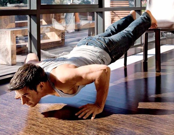 левую руку передвинь как можно ближе к правой, выставив затем последнюю на уровень плеча. Опять отожмись. Данное упражнение достаточно сложное, но зато одно повторение заменяет целых два отжимания. Поверь, твоя грудь оценит это. 3. Отжимания узким хватом Прими упор лежа. Руки поставь таким образом, чтобы большие пальцы прикасались друг к другу. Сделай от 10 до 15 повторений, при этом отдыхай между подходами лишь по паре минут. Не забывай о трицепсах — их надо качать вместе с мышцами груди. 4. Отжимания с опорой Как только ты преодолел две недели тренировок, к жиру на твоей груди прибавились долгожданные мышцы. Пришло время браться за новые упражнения. Тебе понадобится напольный бокс. Прими упор лежа и положи одну руку просто на пол, а вторую – на возвышение. В таком положении тебе необходимо сделать 4 подхода, в каждом — по 15 отжиманий на каждую из рук. При этом отдыхать можно лишь 1—2 минуты. 5. Замена рук В упоре лежа левую руку необходимо подложить на бокс. Теперь старайся поднять тело до того момента, пока правая не станет полностью прямой. Затем меняй руки местами и делай те же упражнения. Всего осиль 4 подхода по 15 отжиманий. 6. Прыжки на руках Как только вторая фаза подойдет к концу, на протяжении пятой и шестой недели следует отжиматься со сменной опорой. Иными словами, во время подъема тела сразу же резко перемещай руки с бокса на пол, а затем и наоборот – возвращай их в исходное положение.