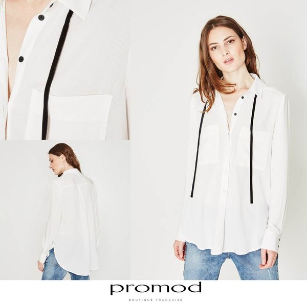 Женственная белоснежная рубашка из новой коллекции Promod! Свободная блузка из струящегося материала, декорированная завязками, придающие романтический характер. Дополнить такую рубашку можно юбкой, брюками или джинсами. Цена: 19 990 KZT Европейский размер: 36—42 Материал: 100% полиэстер На сайте:
