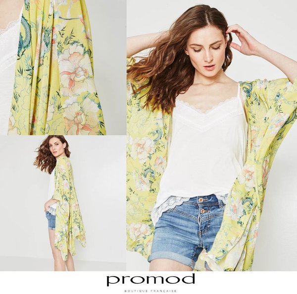 Очаровательный легкий удлиненный жакет-кимоно с цветочным принтом из новой коллекции Promod! Модель имеет свободный силуэт, объемные рукава 3/4. Отличный вариант для летнего сезона! Цена: 17 990 KZT Размер: One size Материал: 100% вискоза На сайте: