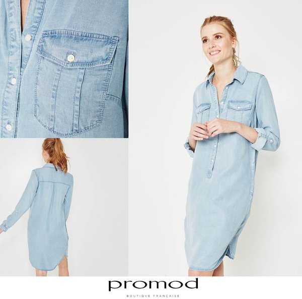 Универсальное и актуальное платье из денима от Promod! Образ состоящий из джинсового платья получается одновременно комфортным и стильным. Цена: 17 990 KZT Европейский размер: 36—42 Материал: 100% лиоцелл На сайте:
