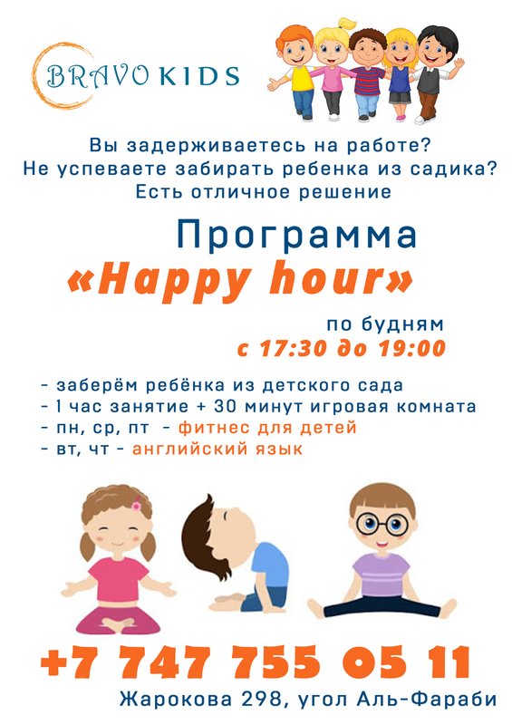 Каждый день с 17:30 до 19:00, забираем детей из детского сада, 1час идет занятие (англ.яз, фитнесс и изо), и 30минут дети проводят в игровой комнате. А родители не торопясь едут с работы и не переживают чем занят их ребенок. .