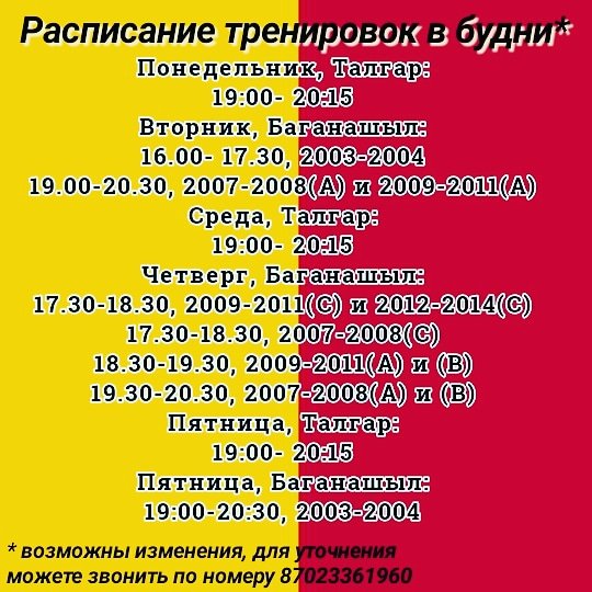 Понедельник, Талгар: 19:00- 20:15 Вторник, Баганашыл: 16.00- 17.30, 2003—2004 19.00—20.30, 2007—2008(А) и 2009—2011(А) Среда, Талгар: 19:00- 20:15 Четверг, Баганашыл: 17.30—18.30, 2009—2011(С) и 2012—2014(С) 17.30—18.30, 2007—2008(С) 18.30—19.30, 2009—2011(А) и (В) 19.30—20.30, 2007—2008(А) и (В) Пятница, Талгар: 19:00- 20:15 Пятница, Баганашыл: 19:00—20:30, 2003—2004 ⠀ *возможны изменения, для уточнения можете звонить по номеру