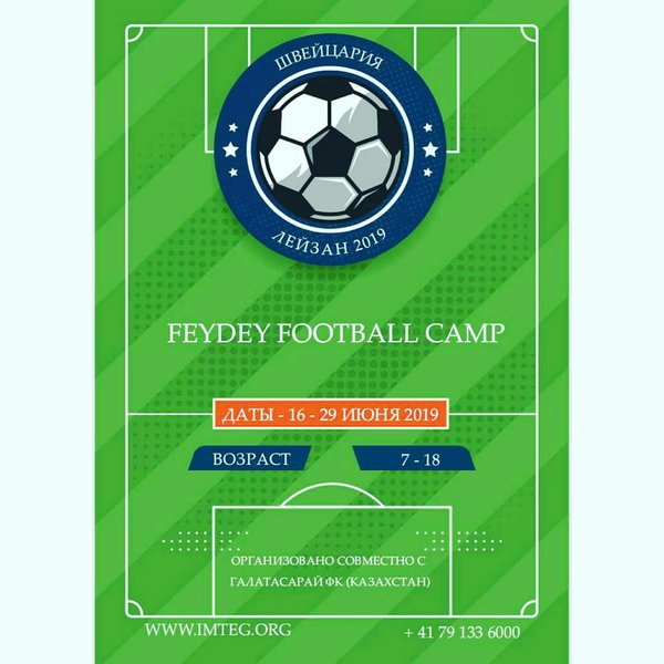 Футбольный и Языковой лагерь в Швейцарии! Совместно с Футбольной Школой «Галатасарай Казахстан» Возраст : 7 — 18 лет Даты : 16—29 июня 2019 Регистрация до 30 апреля 2019 В стоимость включено: питание, проживание, обучение, трансфер В стоимость НЕ входит: Виза, Страховка, авиабилет Обязательное сопровождение Швейцарской Академии ВСЕ ПОДРОБНОСТИ и регистрация по телефону