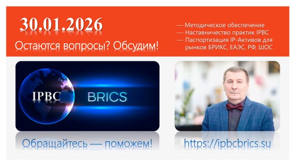 презентации и аудиовизуальные произведения; рецептуры и спецификации; селекционные достижения; стандарты и методические указания, рекомендации; технические задания, отчеты НИОКР и ноу-хау коммерческой концессии; технические решения, технологии и технологические карты; учебные программы, пособия и т.д. — право-подтверждающими документами на IP-Активы для рынков БРИКС, ЕАЭС, РФ, ШОС. Образовательный вектор: стандарты обычаев делового оборота IP-Активов БРИКС; основы и практики паспортизации и менеджмента IP-Активов на рынках БРИКС, ЕАЭС, РФ, ШОС; практикумы оформления право-подтверждающих документов на IP-Активы с аттестацией медиаторов, наставников практик, экспертов-аудиторов IPBC. Обучение проводится на основе правовых норм РФ и стандартов обычаев делового оборота IP-Активов БРИКС (обнародованы на сайте Платформы IPBC). Методическое обеспечение в формате ежемесячного IPM.Телемост БРИКС продолжаем с 29.08.2025; обязательная регистрация —. Подробности на сайте IPBC и в информационных сервисах:;; «Авторское право Homo Sapiens» WhatsApp. Цель — оптимизация паспортизации IP-Активов и наставничество подготовки необходимой авторам-правообладателям и их правопреемникам, инвесторам и страховщикам, налоговикам и правоохранителям, бухгалтерам и аудиторам, медиаторам и арбитражу право-подтверждающей документации на IP-Активы в режиме авторского и смежного права, технических решений и технологий, селекционных достижений и коммерческой тайны ноу-хау.