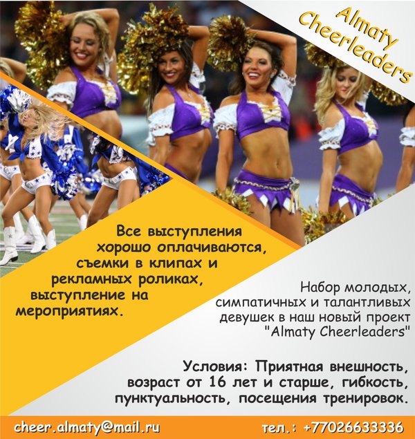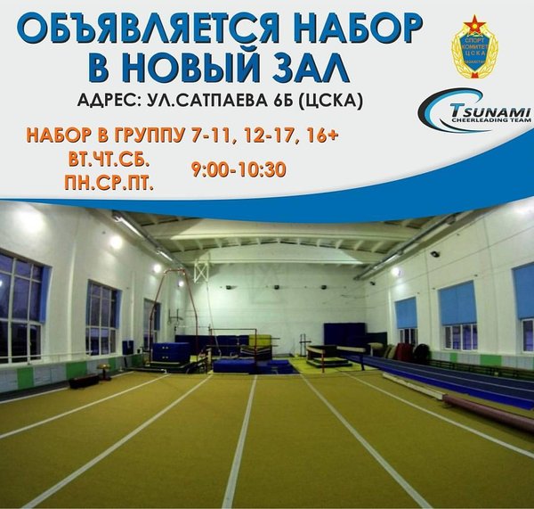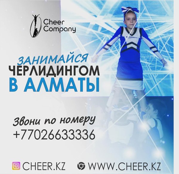 Набор в группы: 7—11 лет, 12—17 и 16+ Адрес: Ул.Сатпаева между пр.Достык и ул.Фурманого (ЦСКА) Дни тренировок: пн.,ср.,пт. и вт.чт.сб. 09:00—10:30 Оплата: 24.000тг. в мес.(скидка для детей из одной семьи) или писать в л.с. Тел.:; Наш сайт: Instagram: @cheer.kz