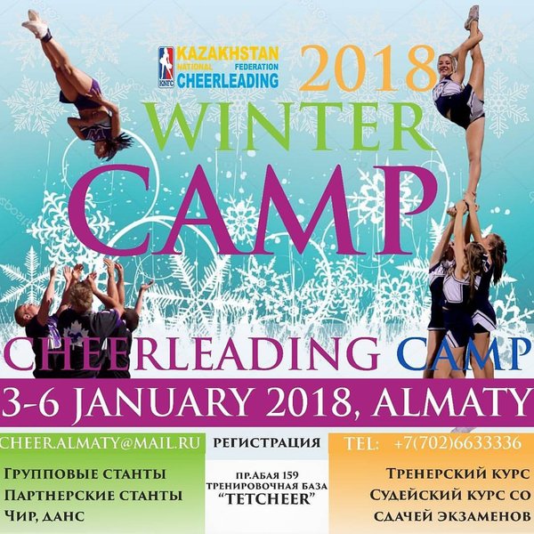 Зимние сборы по черлидингу пройдут с 3—6 января. Групповые станты, чир, чирданс, партнерские станты по новым правилам IFC. Так же пройдет тренерский семинар и судейский со сдачей экзаменов. Регистрация по тел. или по почте cheer.almatymail.ru