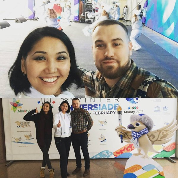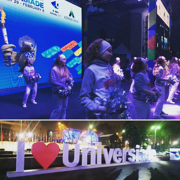 Кальмаганбетова А.С., Князьков И.Ю. тренера клуба черлидинга #Tetcheer и Бектай Кымбат руководитель студенческой лиги черлидинга @unicheerkz на 28й зимней универсиада.