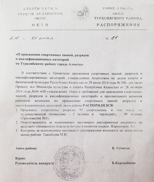 1 июня 2016 г. были присвоены спортивные рязряды 95 спортсменам в том числе 5 человек — художественной гимнастике и 90 человек- черлидингу. Наш спорт стремительно набирает обороты. Almaty, Kazakhstan