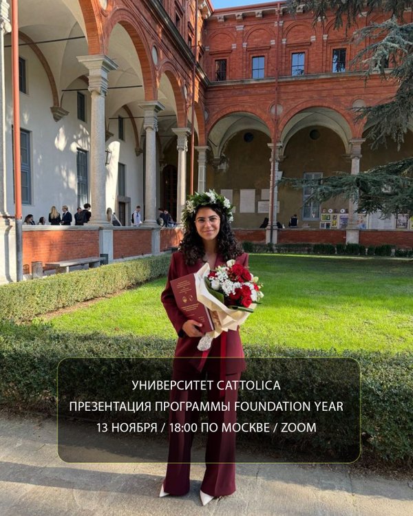 удентов Возможность поступления на бакалавриат на английском или итальянском языках На презентации вы узнаете о структуре обучения, сроках и требованиях к подаче документов, адаптации студентов в новой стране, а также о возможностях, которые открывает Foundation Year в Università Cattolica. Когда: 16 октября в 19:00 по московскому времени Формат: ZOOM // онлайн Спикер: Бернардо Паоли Подробности и регистрация по ссылке -