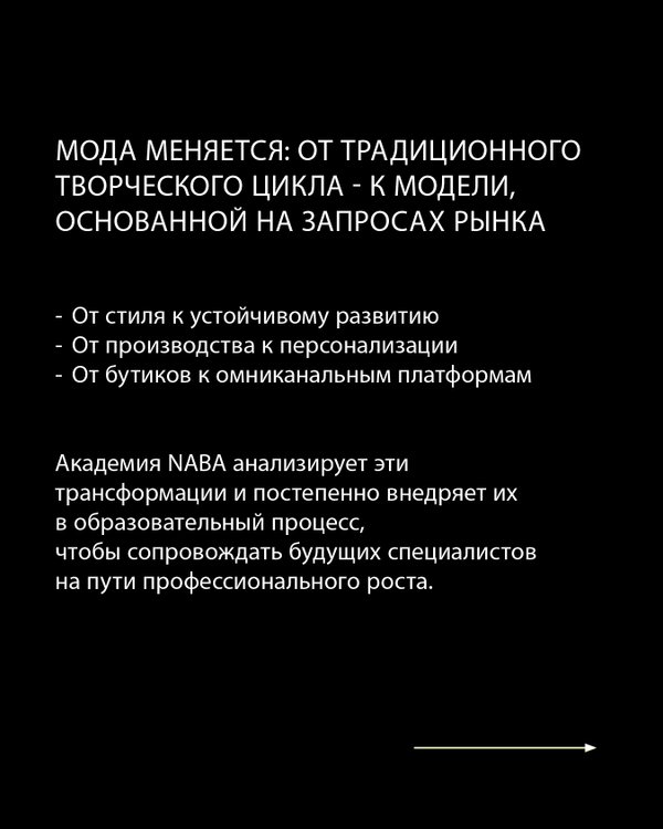 римент, каждая идея готовят студентов к работе в быстро меняющейся индустрии моды. Листайте карусель, чтобы увидеть, какие направления определяют будущее модных профессий. Подписывайтесь на нас, чтобы узнавать больше полезного об обучении и карьере за рубежом. А если возникли вопросы по поступлению в NABA, то пишите нам Мы на связи!