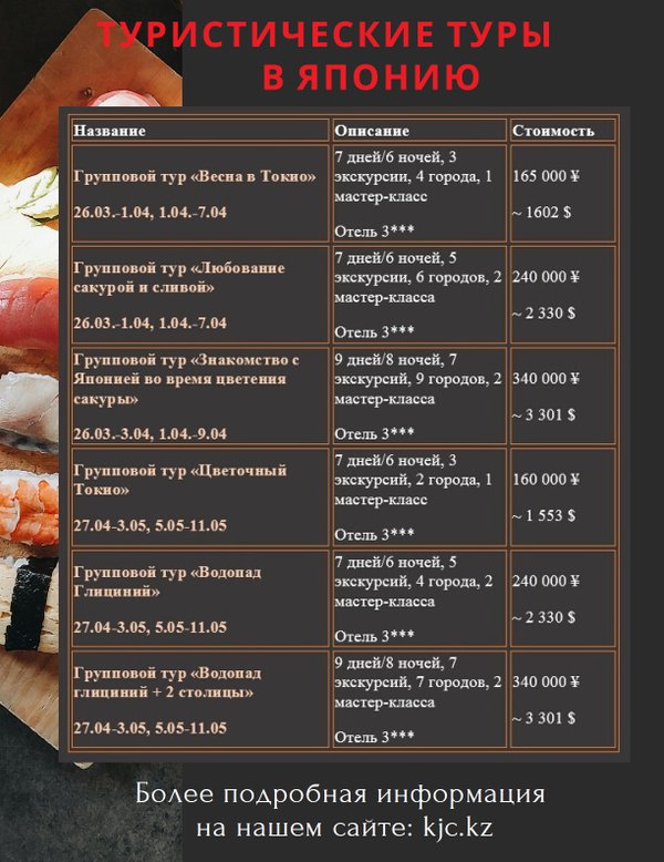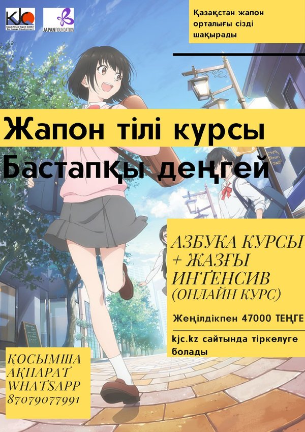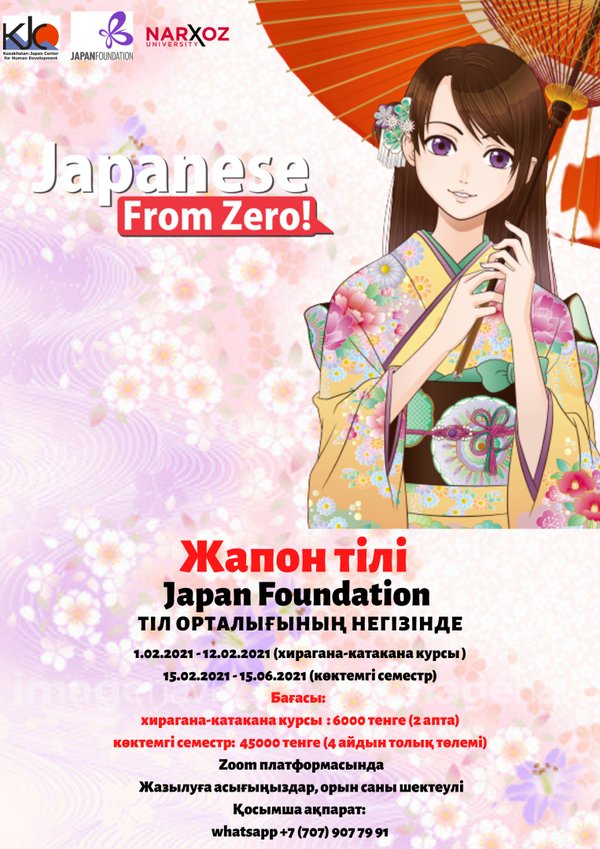 Внимание, идёт набор на новый семестр! Форма обучения весенних курсов — онлайн Курс японской азбуки — 10 уроков (6000 тг.) Весенний семестр японского языка — 60 часов с 15.02 по 15.06.2021 года (45000 тг.) (Окончание семестра на каждом уровне может отличаться) Успей записаться по акции 2 курса общей стоимостью 47000 тг.! Записаться можно на сайте Все вопросы можно задать написав или позвонив по номеру
