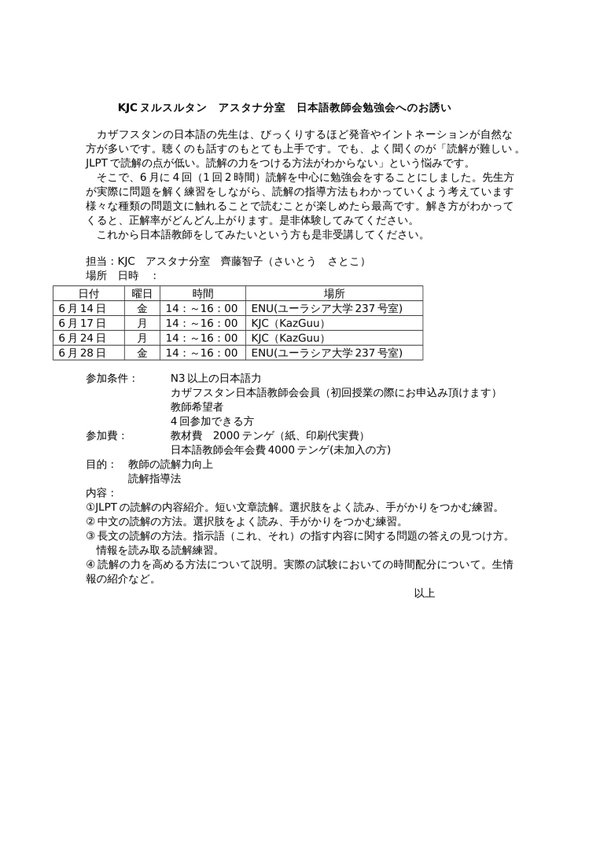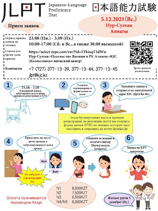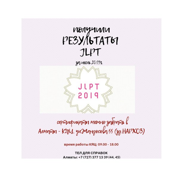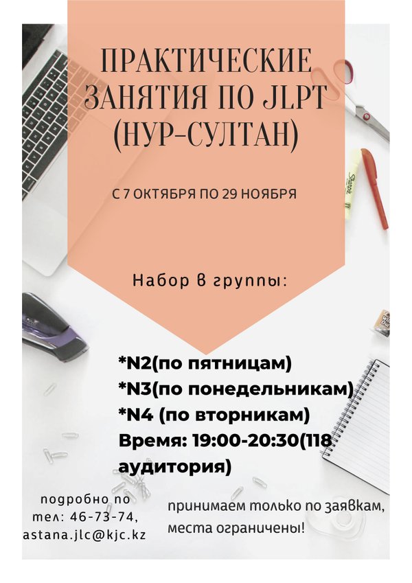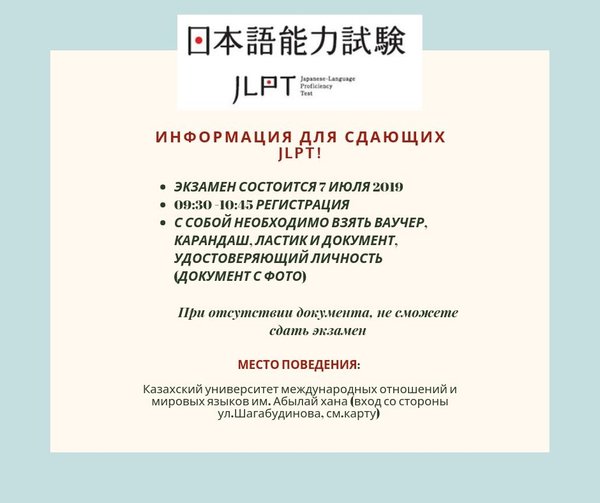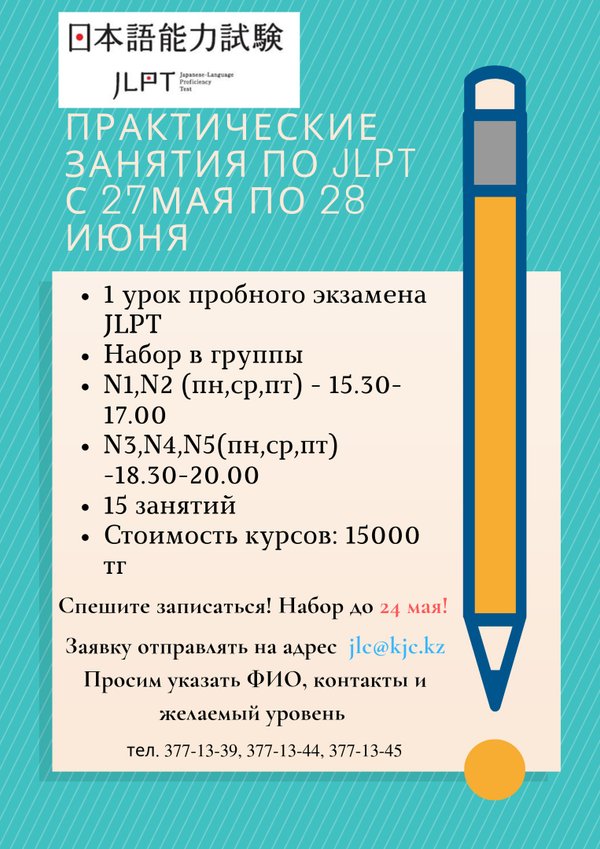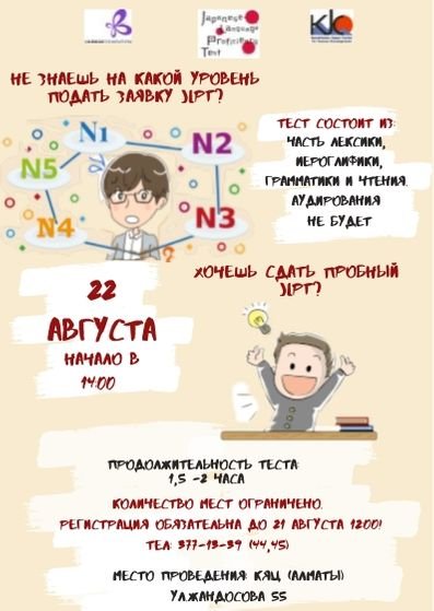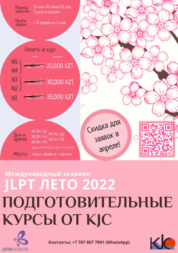 Приём заявок открыт! Спустя долгое время мы вновь открываем курсы по подготовке к международному экзамену JLPT лето 2022 (Nihongo noryoku shiken)! Успейте подать заявку в апреле, чтобы получить скидку! Запись по ссылке: Приём заявок: с 8 апреля по 5 мая Период занятий (офлайн, Алматы): 11 мая – 30 июня. Всего 15 уроков. Количество раз: 2 раза в неделю (см. предварительное расписание) Время: 18:30—20:00. Длительность уроков может варьироваться в зависимости от уровня! Оплата: от 25,000тг и выше (см. постер)