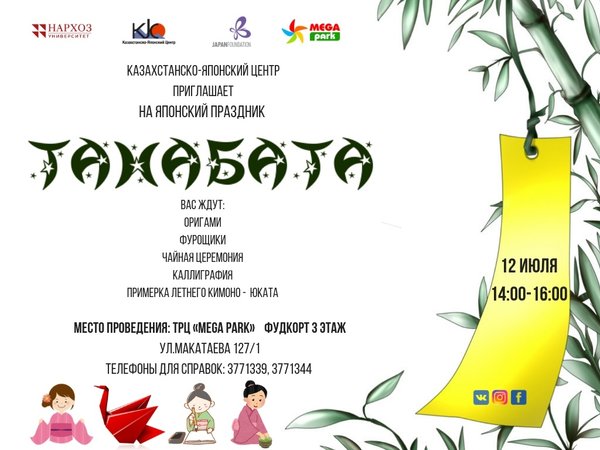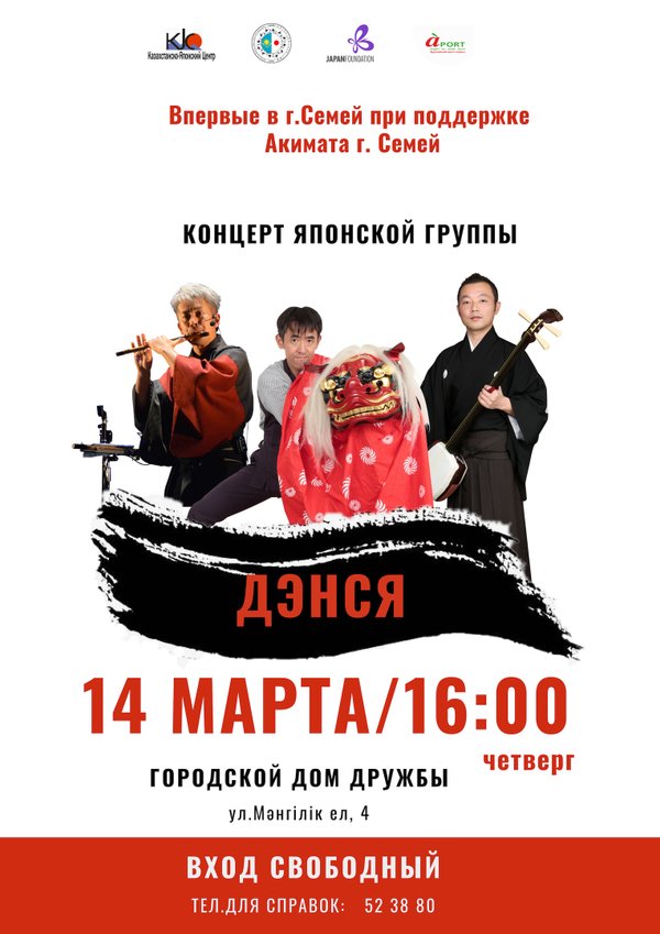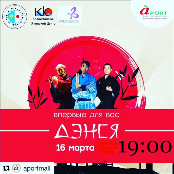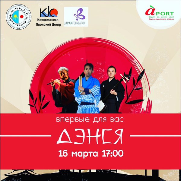 По техническим причинам музыкальное трио «Дэнся» задержалось в г.Усть-Каменогорске, поэтому время концерт в Алматы переносится на 19:00. Но мы приготовили для вас уголки и мастер-классы по японской культуре, которые будут работать с 17:00! Ждем вас! Место встречи: Молл Апорт, новое крыло Пьяцца, возле кассы аквапарка Майами! (Участие бесплатное)