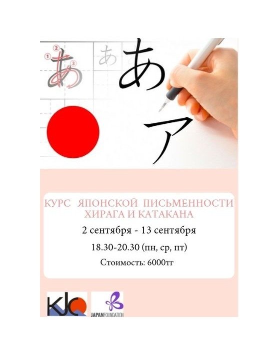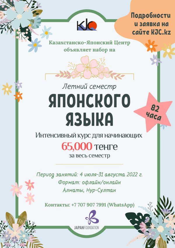 Внимание, идёт набор на новый семестр! Форма обучения летних курсов — онлайн Курс японской азбуки — 10 уроков (6000 тг.) Летний семестр японского языка — 60 часов с 05.07 по 31.08.2021 года (45000 тг.) Успей записаться по акции 2 курса общей стоимостью 47000 тг.! Записаться можно на сайте Все вопросы можно задать написав или позвонив по номеру