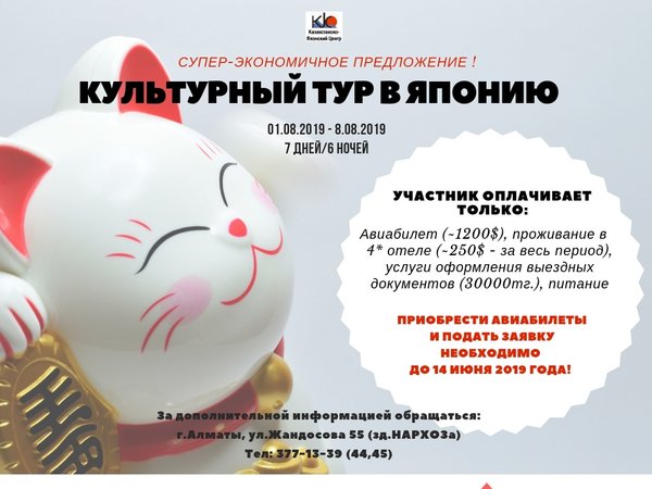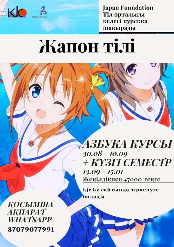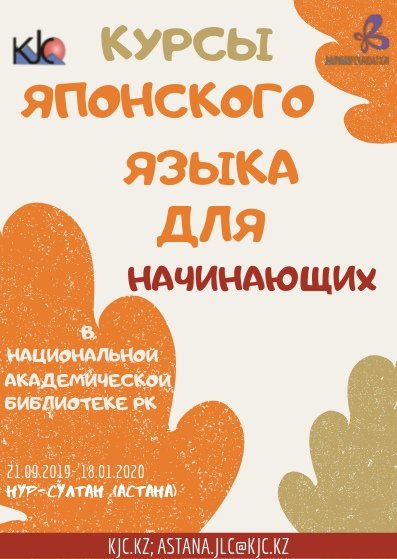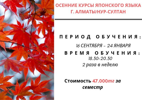 Внимание, идёт набор на новый семестр! Вас ждет самый интересный курс японского языка по методике системы Маругото! Курс японской азбуки — 10 уроков (6000 тг.) Осенний семестр японского языка — 64 часа с 13.09 по 15.01.2022 года (45000 тг.) Успей записаться по акции 2 курса общей стоимостью 47000 тг.! Записаться можно на сайте Все вопросы можно задать написав или позвонив по номеру