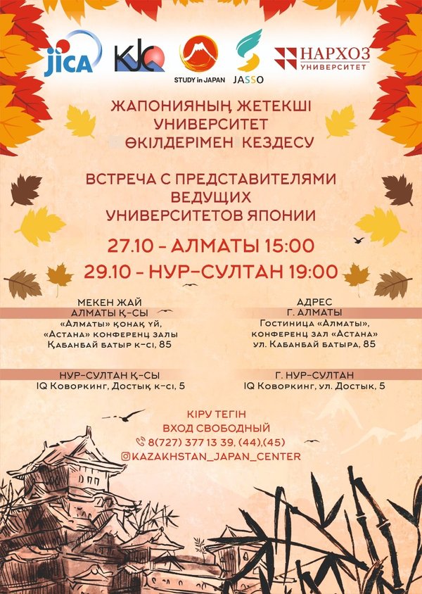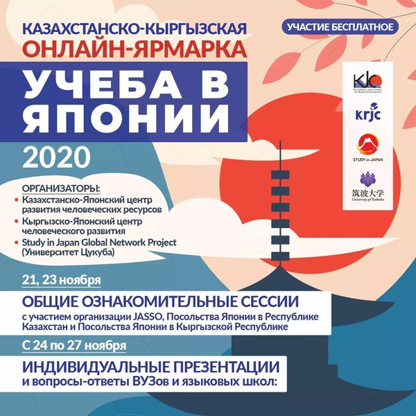 ептері 21—23 қараша аралығында JASSO ұйымының ұйымдастыруымен Қазақстан және Қырғызстан Республикасындағы Жапония елшілігінің қатысуымен түсіндіру, таныстыру жұмыстарын жүргізеді. 24—27 қараша аралығында, 1 апта бойы, ZOOM платформасында әр Университет туралы жеке түсіндіру, таныстыру жұмыстарын жүргізеді. ЕҢ БАСТЫСЫ, осы аталған іс-шараға қатысу -ТЕГІН!!! Ол үшін қатысуға деген ниетіңіз болып, тіркелуден өтсеңіз жеткілікті. (Тіркелуге арналған сілтеме) Көкейіңізде жүрген барлық сұрақтарға жауап алғыңыз келсе, қатысуға асығыңыз. Қатысушы университеттер тізімі: 1. Akita University 2. Eikei University of Hiroshima 3. Kanazawa University 4. Nagasaki University Graduate School of Biomedical Sciences 5. Ritsumeikan Asia Pacific University 6. Ritsumeikan University 7. Teikyo University Graduate School of Science and Engineering 8. Tokai University 9. Tokyo International University 10. University of Tsukuba Тілдік меткеп: 11. Ohara Japanese Language School