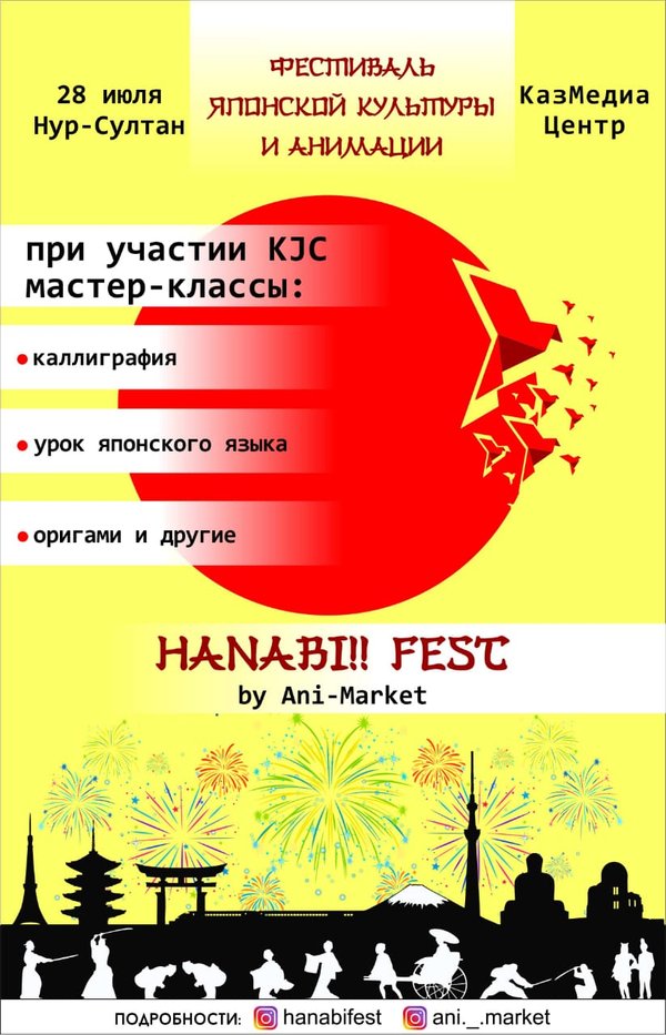 На Фестивале будут представлены аниме товары, мастер классы по каллиграфии, оригами и боевым искусствам, шоу-программа, японские вкусняшки и настоящая японская кухня! Конкурс косплея, AMV и многое другое! Казахстанско-японский центр представит мастер-классы по каллиграфии, урок японского языка и оригами. Специально приглашенные гости — профессиональный косплеер Геша Петрович и «Анкорд»!