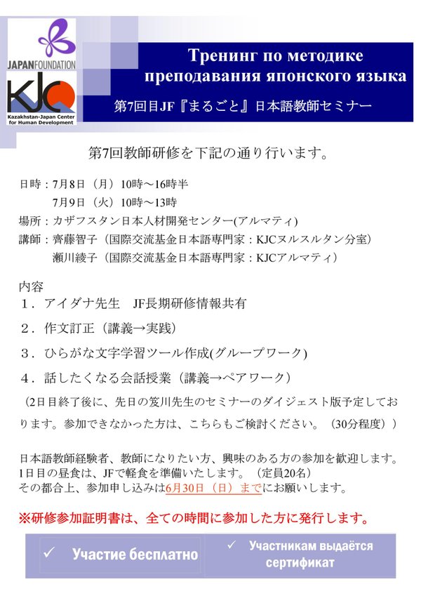 Открыт набор на тренинг по новейшей системе преподавания! Вы познакомитесь со стандартом Japan Foundation, а также с учебниками Маругото. Этот тренинг ориентирован для всех, кто желает обучать по уникальной методике JF и тех, кто только начинает свой путь сенсея. Успейте записаться! Заявка по ссылке: