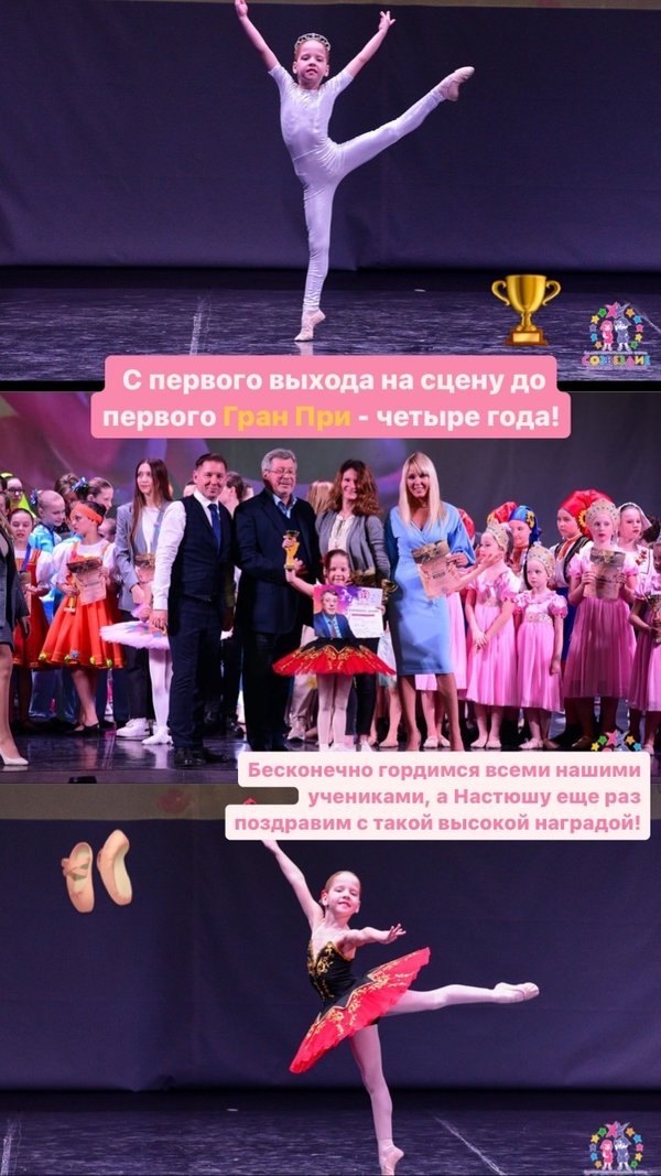 Друзья, у нас событие! Наша прекрасная ученица Анастасия Фролова заняла Гран-При на Международном Конкурсе «Мир балета и грации» Настя сейчас занимается в школе на Юго-западной Педагог Ольга Лоленко ▫️Первое посещение «Балет с 2-х лет» филиал Солнцево — ноябрь 2018, 2,5 года ▫️Первое участие в отчётном концерте — май 2019, почти 3 года ▫️Первое участие в конкурсе — 5 лет С первого выхода на сцену до первого Гран При — четыре года! Очень гордимся всеми нашими учениками, а Настюшу еще раз поздравим с такой высокой наградой! ️