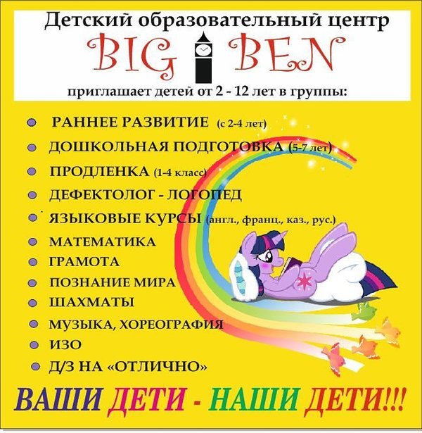 Дорогие друзья, рады вам сообщить что мы открываем детский образовательный центр ️ ️ ️ РАНЕЕ РАЗВИТИЕ (с 2—4 лет) ДОШКОЛЬНАЯ ПОДГОТОВКА (5—7 лет) ️ ️ ️ ️ ПРОДЛЕНКА (1—4 класс) ДЕФЕКТОЛОГ — ЛОГОПЕД ️ ️ ЯЗЫКОВЫЕ КУРСЫ (англ., франц., каз., рус.) МАТЕМАТИКА ГРАМОТА ️ ️ ПОЗНАНИЕ МИРА ️ ️ ШАХМАТЫ МУЗЫКА, ХОРЕОГРАФИЯ ИЗО Д/З НА 《ОТЛИЧНО》 @ Big Ben English course