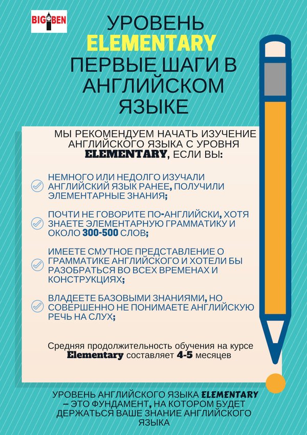 цию. Ваша главная задача на любом уровне — научиться говорить (Speaking). На уровне Elementary вы уже сможете принимать участие в небольшом диалоге, задавать вопросы в рамках изученных вами тем и понимать ответы на них, особенно. Вы сможете рассказать монолог из 5—10 предложений о себе, своей семье, увлечениях. На уровне A1 Elementary вы научитесь понимать на слух (Listening) отдельные знакомые слова и простые фразы, которые звучат довольно медленно и четко. В качестве материала для аудирования используются простые тексты и диалоги, которые будут понятны вам полностью после второго прослушивания. Что касается чтения (Reading), новые тексты на английском языке будут присутствовать почти на каждом уроке. Каждый из этих текстов — источник новых слов и выражений, которые вам предстоит выучить на этом уровне. На курсе Elementary происходит изучение основного словарного запаса: вы учите самые нужные в повседневной жизни слова и фразы. Что касается письма (Writing), то обучение начнется с простейших действий. Вы научитесь подписывать открытки, заполнять небольшие анкеты, где надо указать имя, фамилию, национальность и так далее. К концу уровня вы уже сможете писать небольшие сочинения и личные письма. ___ Срок изучения английского на уровне Elementary зависит от индивидуальных особенностей ученика и его начальных знаний. Средняя продолжительность обучения на курсе Elementary составляет 4—6 месяцев. А тем, кто хочет проверить свои знания английского языка, предлагаем пройти тестирование и записаться на БЕСПЛАТНЫЙ ПРОБНЫЙ УРОК в нашем центре. ___ Наши адреса: ул Толе би 73, уг ул Наурызбай батыра 71 пр. Абая 75, уг ул Масанчи _