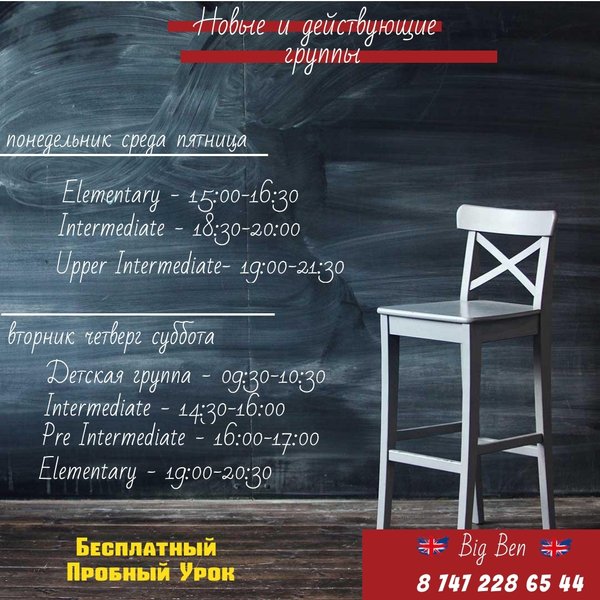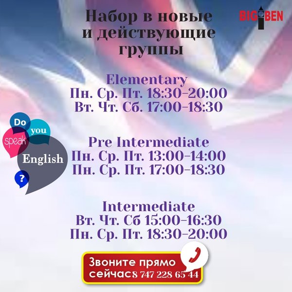 Начни новый год с изучения английского языка! Не откладывай на потом __ Не знаешь свой уровень? Приходи и мы бесплатно за 15 минут определим и проконсультируем индивидуально! Образовательный центр «Big Ben» выпустил более 1000 учеников и зарекомендовал себя как один из лучших обучающих центров. __ ПОЧЕМУ ВЫБИРАЮТ НАС: 8 лет на рынке образовательных услуг ⏰Гибкий график работы — утром, днем, вечером и в выходные Офис в самом центре Алматы Сертифицированные преподаватели Все наши студенты достигают своих целей __ КАК МЫ УЧИМ АНГЛИЙСКОМУ… — Читать дальше