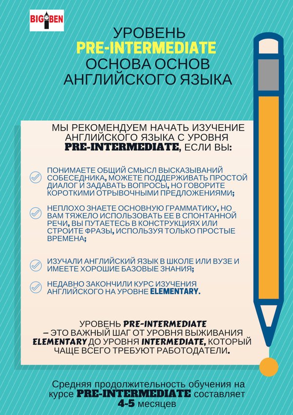 ием в деловой сфере.. Вы запоминаете не просто слова, а целые фразы в контексте, учитесь строить новые слова с использованием префиксов и суффиксов. Аудирование (Listening) Ученик уровня Intermediate может понимать фактическую информацию, связанную с работой, учебой и повседневной жизнью, различая как общий смысл, так и отдельные детали; при этом речь может быть с небольшим акцентом. Что касается чтения (Reading), уровень Intermediate позволяет понимать довольно сложные, хотя еще адаптированные тексты, однако можно пробовать читать неадаптированную литературу. Все тексты для чтения уровня Intermediate являются своеобразным «контекстом» для закрепления и автоматизации использования изучаемой лексики и грамматики. Еще один аспект, которому уделяется немало внимания, — письмо (Writing). Вы узнаете, как составлять английские предложения не только разговорного, но и официального стиля. __ ⏳Продолжительность изучения английского на уровне Pre-Intermediate может варьироваться в зависимости от стартовых знаний и индивидуальных особенностей ученика. В среднем срок обучения составляет 4—6 месяцев. ___ Наши адреса: ул Толе би 73, уг ул Наурызбай батыра 71 пр. Абая 75, уг ул Масанчи _