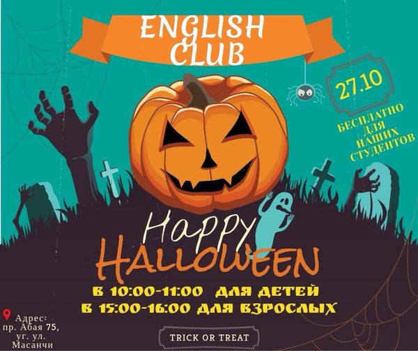 Knock Knock, Trick or treat?) Дорогие наши студенты и все желающие, ЗАВТРА 27.10 в нашем центре по адресу: проспект Абая 75, уг ул Масанчи, будет проходить ENGLISH CLUB С НОСИТЕЛЕМ на тему HALLOWEEN ⏰в 10:00—11:00 для детей. Будет угощение и веселье ⏰в 15:00—16:00 для взрослых, welcome . Для наших студентов совершенно БЕСПЛАТНО А для тех, кто у нас не обучается, стоимость разового посещения 1000 тг, а кто хочет участвовать в English club каждую субботу- абонемент 2500 тг за месяц . Приходите, ждём всех!