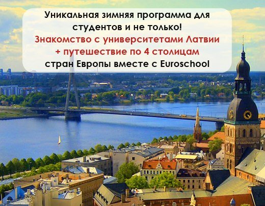 Ознакомительный тур по университетам Латвии — это уникальная программа, которая позволит участникам познакомиться с 7 популярными рижскими университетами, а также получить увлекательное путешествие по Латвии и в столицах соседних стран (Стокгольм, Таллин, Вильнюс). Торопитесь забронировать место до 10 декабря. Мест всего 25! Подробно о программе узнайте здесь>