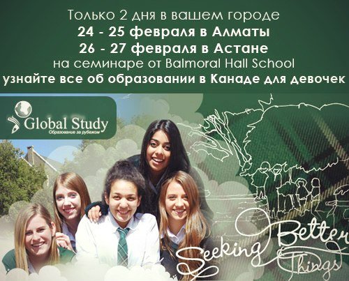 Представители Balmoral Hall School — школы для девочек 12—18 лет в Канаде, проведут семинары и ответят на все вопросы по образованию в Канаде. Balmoral Hall School — это путь к поступлению в лучшие университеты Канады, а также к получению элитного образования. Миссия школы — помочь девушкам построить хорошо сбалансированную основу для личного и профессионального успеха в меняющемся современном мире. Семинары пройдут в офисах Global Study 24—25 февраля в 16:00 в Алматы и 26—27 февраля в 16.00 в Астане Торопитесь записать на семинар! Места огран… — Читать дальше