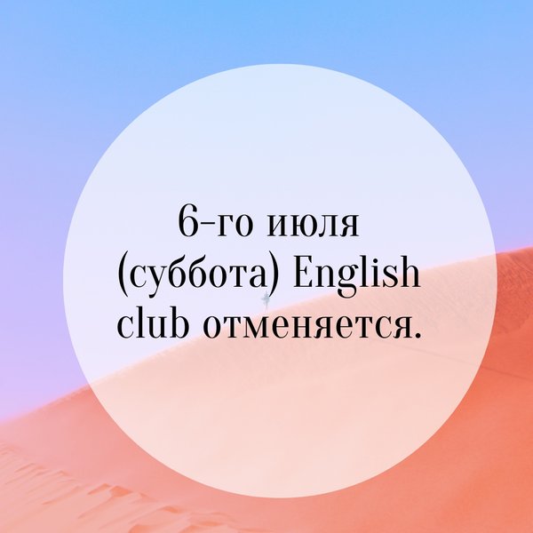 Уважаемые студенты! Хотим вас оповестить о том, что в эту субботу English Club не будет проводиться. Еще раз напоминаем, что в связи с государственным праздником, 6-го июля (суббота) IBH не работает.