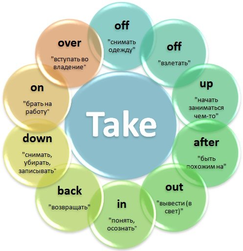 отвела его в сторону. 4) Take along – приводить, брать с собой (в дорогу), привозить; He took his sister along to school. Он привел свою сестру в школу. 5) Take in – вносить; убирать (паруса), ушивать (одежду); давать приют=брать жильцов; усваивать; обманывать; брать работу на дом; I could not take in the new lesson. Я не смог усвоить новый урок. She made her living by taking in. Она зарабатывала на жизнь, пуская жильцов. This child took us in. Это ребенок нас провел. 6) Take on – брать, нанимать (брать на работу), взять на себя, приобретать, волноваться; сразиться с кем-то; I won’t take on too much responsibility. Я не возьму на себя слишком много ответственности. 7) Take through – объяснять, осуществлять, доводить до конца; Would you please take me through this lesson? Ты не мог бы объяснить мне этот урок? 8) Take up – поднимать; занимать (место), принимать (вызов); снимать, выкапывать; браться за что-то, укорачивать; заниматься чем-то; встречаться с кем-либо; приобретать; I’ll take up your matter, though it seems to be complicated. Я возьмусь за ваше дело, хотя оно кажется сложным. 9) Take to – привязаться, пристраститься; He was taken to his mother and couldn’t do without her. Он был очень привязан к своей матери и не мог без нее обходиться. 10) Take off – снимать (одежду), увозить, уносить, уводить; сделать перерыв в работе; имитировать, копировать; снимать запрет; взлетать; пользоваться успехом, приобрести популярность; The plane will take off at 16:30. Самолет взлетит в 16:30. She took off her hat and put it on the table. Она сняла шляпу и положила ее на стол.