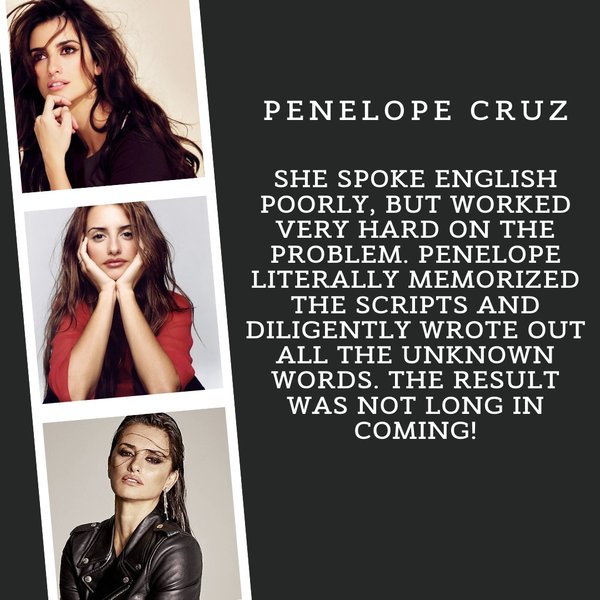 льно точно передать все звуки и интонации человека, который помогал ей с английским. Вот что делает знаменитость при изучении английского языка: 1.Много читает В основном, конечно, чтение сводится к изучению сценариев, однако Пенелопа читает их много раз, поэтому слова и фразы из них хорошо запоминаются. 2.Не боится делать ошибки Пенелопа признается, что до сих пор совершает ошибки в английском, но это не смущает ее и она продолжает общаться на нем.