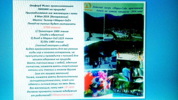 Образовательный центр Оксфорд Фижн организовывает ПИКНИК на природе! Присоединяемся все желающие с нами 8 Мая 2016 (Воскресенье). Место: Талгар Марал-Сай Поход на пикник будет составлять 3700 тенге: 1. Транспорт 1000 тенге (туда и обратно) 2. Вход в Марал-Сай 1215 тенге 3. Еда 1485 тенге (полный завтрак и обед) Будем организовывать для вас разные виды игр и многое интересное, не пропустите и проведите с пользой для вашего здоровья на природе. Взять теплые вещи с собой, одеться потеплее, можете взять спортивные мячики или теннис и многое другое… — Читать дальше