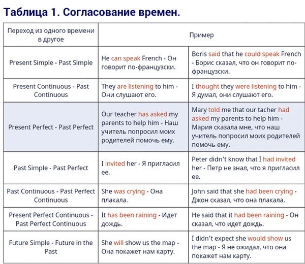 Полезные таблицы по теме «Согласование времен».