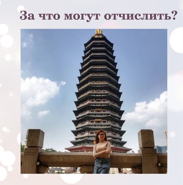 еждать, ругать, потому что? Потому что зачастую они очень вежливые люди. ⠀ И самые частые причины : ДРАКА, особенно если драка с гражданином КНР, даже если в основном это он тебя побил, ты виноват Но, китайцы редко лезут к иностранцам, так же как и друг с другом драки довольно редки. ⠀ РАБОТА, да да, многие «мои коллеги» пишут о работе, и учёбе. ⠀ Но, имея студентическую визу, работать, нельзя. А ребят, и иногда меня, это не останавливает. ⠀ Может это и прибыльно, весело, до тех пор пока вас с поличным не хлопнет полиция, в лучшем случае огромный штраф. В худшем, депортация. ⠀ Что будет после отчисления? Вообще обрезание визы, возможная депортация (если причина например, работа, т.к это нарушение закона), и шанс попасть в чёрный список на ближайшие 3—4 года. ⠀ Но, даже здесь, китайцы очень часто, помогают с полицией, и все сводится к тому, что вы просто едете домой, так как сейчас лучше залечь на дно. И учитесь в следующий раз не в этом месте, а вообще чем дальше, тем лучше ⠀ Учитесь, общайтесь и наводите мосты и все у вас будет хорошо _