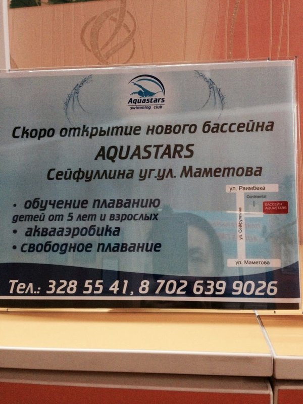 Адреса бассейнов “Aquastars” в Алматы: 1. Плавательный бассейн “Aquastars” общего назначения — расположен по ул. Яссауи, 1Б