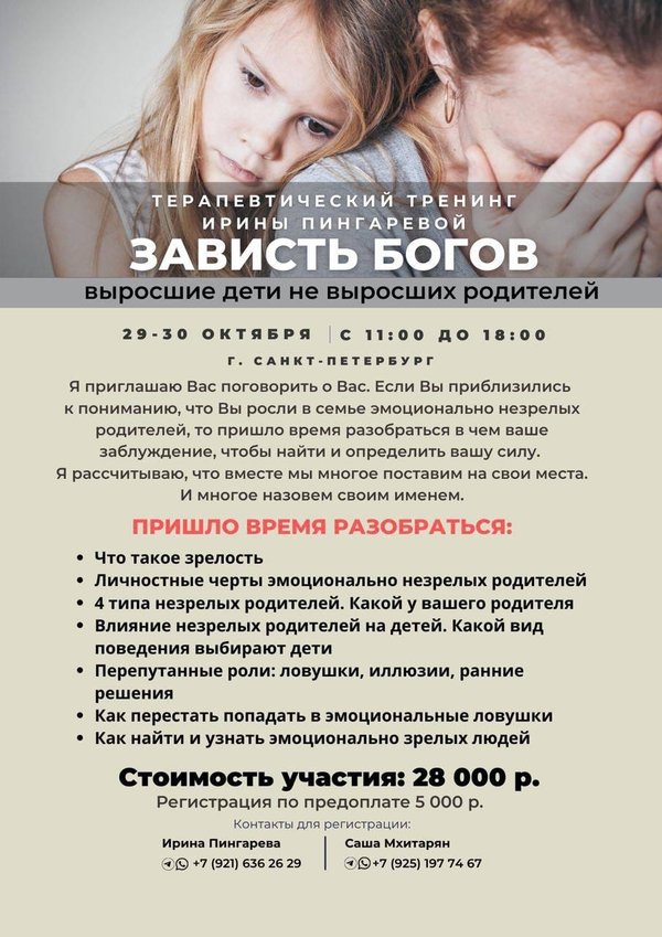 Ирина Пингарева (09.10.2022): Сейчас, как никогда важно собираться вместе и ощущать тепло и поддержку друг друга. Приглашаю Вас в Санкт- Петербург на терапевтический тренинг. Даты: 29—30 октября 2022 Место: Санкт-Петербург, м. Чернышевская, ул. Чайковского, д. 65—67. Время: с 11:00 до 18:00