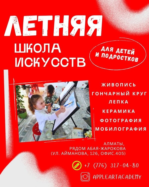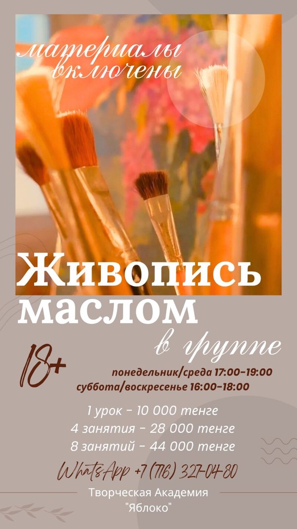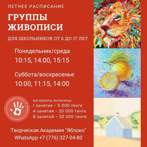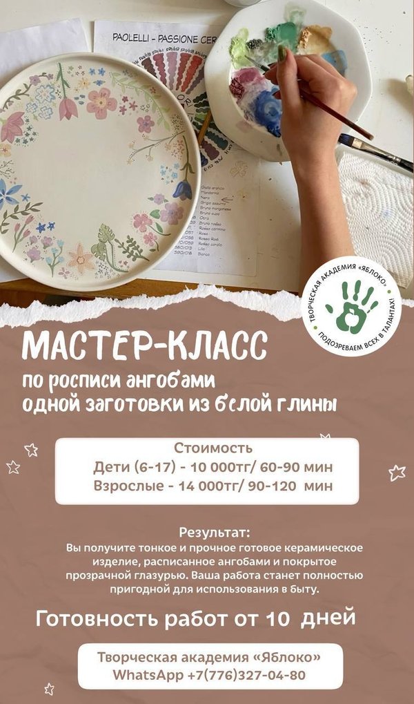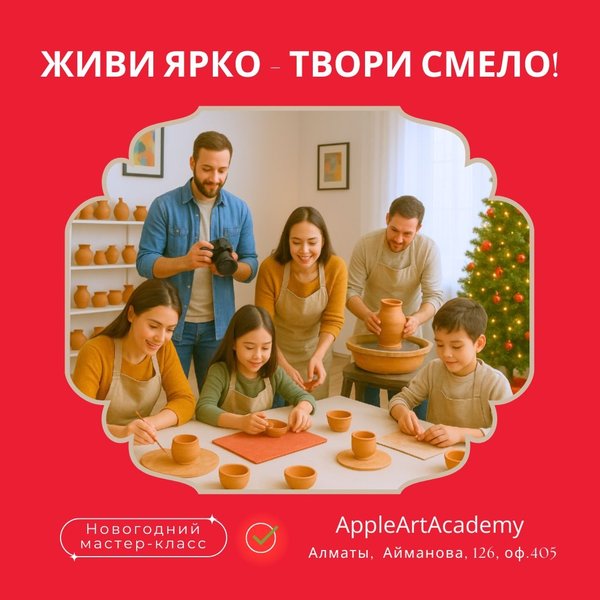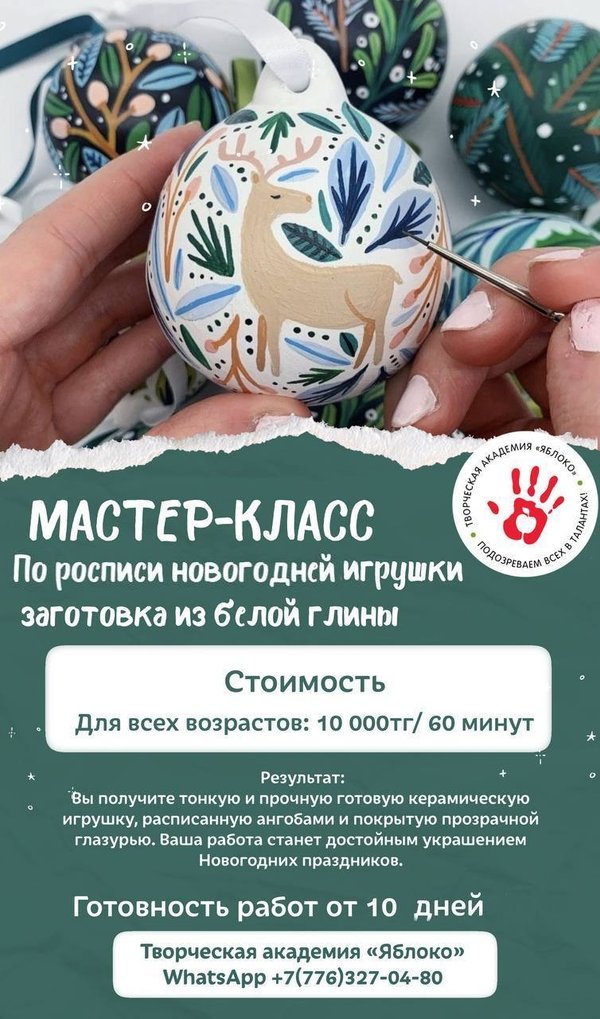 аётся в академии на 2 недели: изделие проходит два обжига, а педагог покрывает его прозрачной глазурью, чтобы рисунок был ярким и долговечным. * Дети (6–17 лет) — 10 000 тг / 60–90 минут * Взрослые — 14 000 тг / 90–120 минут Готовое изделие прочное и полностью пригодно для использования в быту. Мастер-класс «Живопись маслом» Под руководством педагога вы напишете картину маслом на холсте, разберётесь с цветом и композицией и заберёте готовую работу сразу после занятия. * Дети (10–17 лет) — 8 000 тг / 2 часа * Взрослые — 10 000 тг / 2 часа В стоимость входят все материалы и холст на выбор 25×35 или 30×40. Мастер-класс «Новогодняя открытка» За одно занятие вы создадите авторскую открытку формата 20×30 см гуашью, маркерами и карандашами. Работу можно подписать и подарить близкому человеку. * Дети от 5 лет — 5 000 тг * Взрослые — 7 000 тг Длительность — 1–1,5 часа. На все мастер-классы требуется предварительная запись. Количество мест ограничено — записывайтесь заранее и подарите себе радость творчества. WhatsApp: Творческая академия «Яблоко»