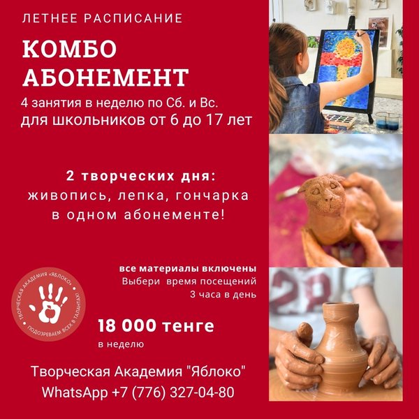 ное? Творить вместе ещё радостнее. Приходите вдвоём с близким человеком, зовите друзей или целую компанию — смех, эмоции и красота, созданная своими руками, объединяют и оставляют воспоминания, к которым хочется возвращаться снова и снова. Стоимость: Взрослые — 14 000 тг Дети от 6 лет — 10 000 тг Забронировать место очень просто: WhatsApp. Не откладывайте — эти мгновения творчества подарят вам гораздо больше, чем просто готовое изделие. ~~~~~~~~~~~~~~~~~ КЕРАМИКА ДЛЯ ДЕТЕЙ И ВЗРОСЛЫХ Будние дни: ДЕТИ и ВЗРОСЛЫЕ- ВТ/ЧТ 17:00 ВЗРОСЛЫЕ- ВТ/ЧТ 19:00 ~~~~~~~~~~~~~~~~~